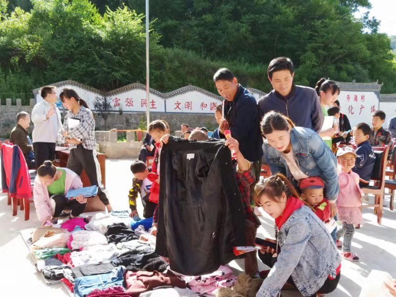 在推广电商扶贫环节结束后,小分队马不停蹄的开展了“兰博善诚”公益认领活动。这次公益认领由两个部分组成:小分队首先给到场的18名学生分发了文具和乒乓球拍,在分发的过程中向有意向报考我校的高考毕业生,讲解我校的优势专业,并向其讲述大学的学习和生活等,鼓励其报考我校。随后小分队先将带着满满爱意的衣服分类、筛选,放在事先准备好的毯子上,让村民在挑选衣物的时候更加方便。在衣物捐赠活动开始后,现场闻迅而来的村民络绎不绝,村民们挑选着适合自己的衣服。在活动的现场,志愿者们帮助居民挑选、试穿衣物,朴实的村民在领到衣物后都露出了开心的笑容。