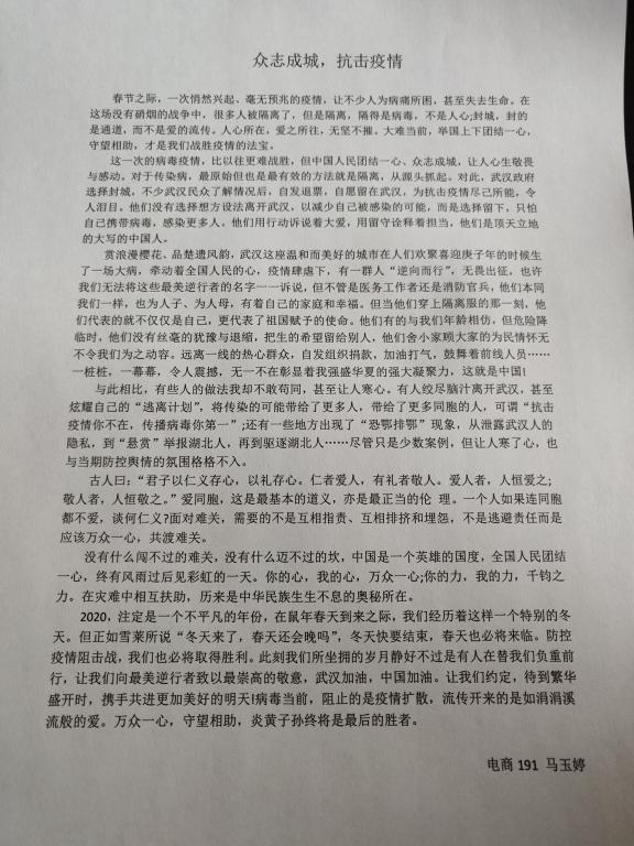 社会是最好的课堂。每一次应对的重大危机,都应成为教育的重要契机。疫情当前,yl6809永利集团举办“万众一心,抗击疫情”为主题的征文与短视频征集活动,旨在引导教育学生走出书本,放眼当前我们的国家和民族,以笔聚力,以文传情,在学习成长的过程中做到“知行合一,厚植家国情怀”。