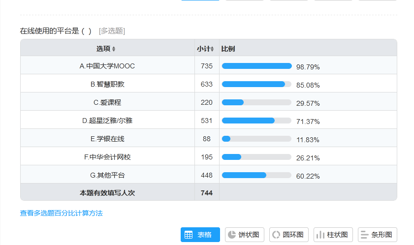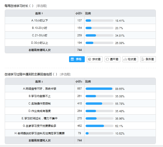 本次问卷调查有效填写人次为744人,达到总人数的98.69%。对线上教学调查结果表明:学生在线学习使用的电子设备主要是手机(95.97%),在线教学使用的平台以中国大学MOOC、智慧职教和超星平台为主(98.13%),学生每周在线学习时长达到21-30小时(34.81%),学习时长达到30小时以上(26.08%),在线学习过程中遇到的主要困难是网络信号不好、系统卡顿(占比89.65%),87.5%学生能够按时按质完成教师布置的作业和测试,对于目前的在线授课方式79.7%学生能适应,95.97%的学生认为授课教师对于课内上课时间与自主时间分配合理,对在线学习效果的满意的学生达到93.15%,学院教师组织线上教学时最主要授课方式为在线直播讲授(77.78%),其次为发布资源组织问题讨论(53.41%),同时利用慕课等线上资源,多种方式并行,保证了教学资源的丰富。线上教学中97.75%学生反馈课堂教学中有互动,认为课程互动顺利有效。