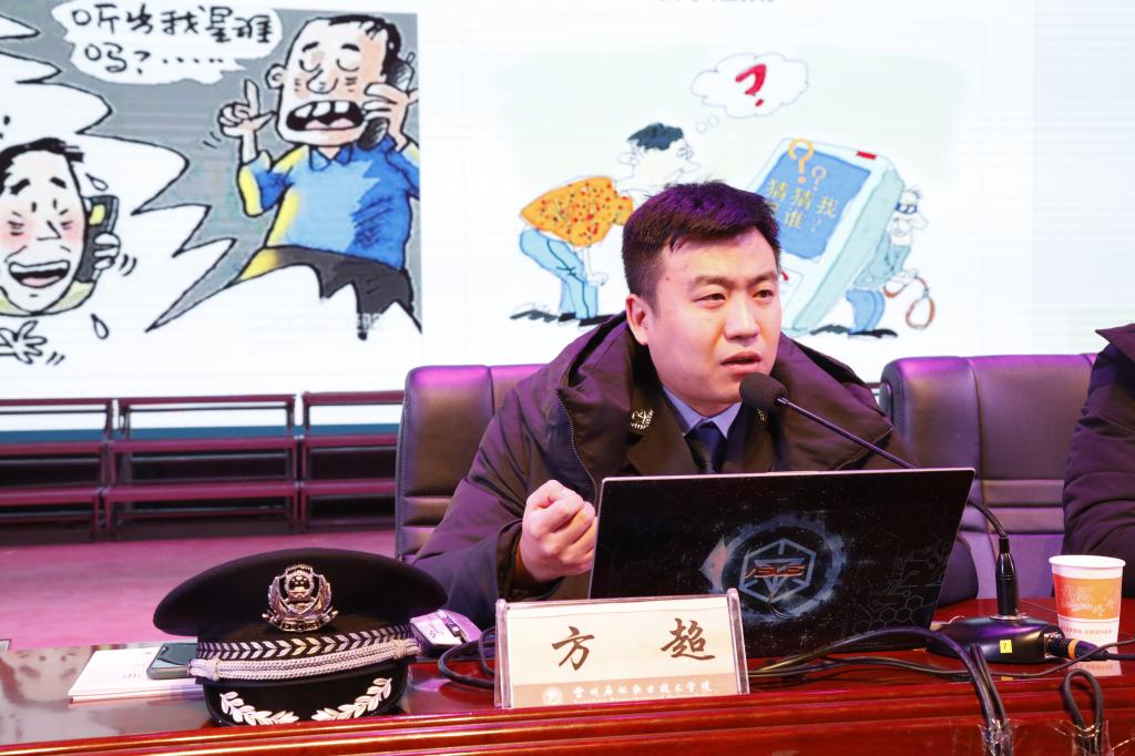 方超警官长期从事电信诈骗案件侦办和防范电信诈骗宣传工作,具有丰富的案件分析研判和宣传教育经验。他从电信诈骗的定义、常见的形式与种类、如何识别防范、上当后的补救措施4个方面讲授了防范电信诈骗知识。特别是旁征博引的20个典型案例引人入胜,在全体师生心中掀起阵阵波澜,留下了深刻印象。他指出防范电信诈骗的根本措施和最有效方法是不能贪图便宜,坚决不能相信“天上会掉馅饼”。