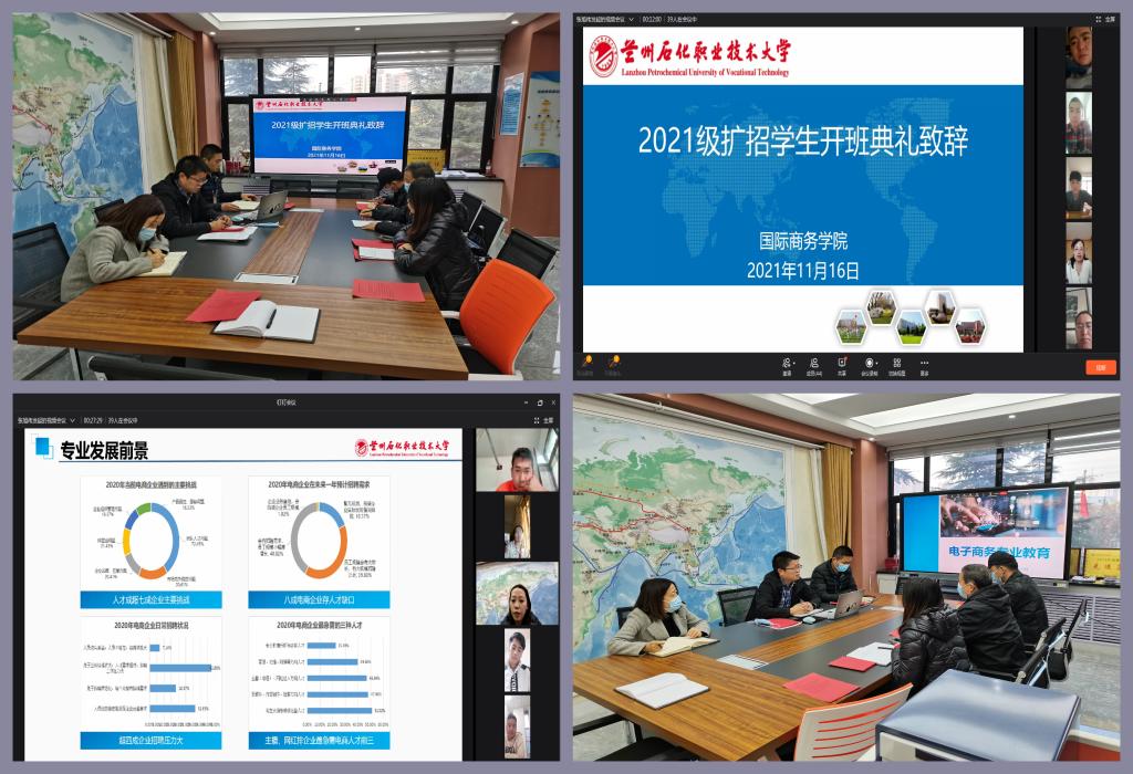 11月16日下午,yl6809永利集团在主教楼三楼会议室召开2021年扩招班学生开学典礼,会议通过钉钉在线会议形式举行,学院领导班子成员、商务教研室主任、辅导员、班主任参加了会议。