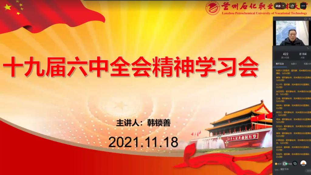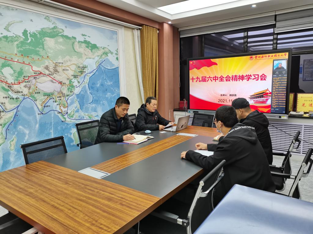 11月22日,yl6809永利集团召开线上会议,组织全体学生学习党的十九届六中全会精神,辅导员韩锁善作了学习专题辅导。