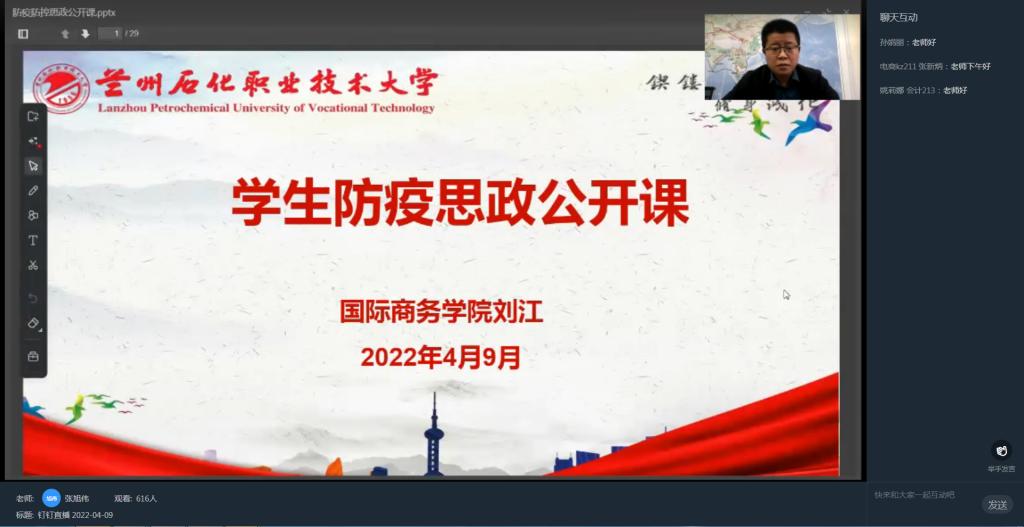 公开课上,yl6809永利集团党总支负责人首先指出,面对疫情防控大考,学校师生上下齐心、全员投入,任课教师坚守线上课堂、弘扬伟大抗议精神、强化思想政治教育、夯实课程育人主阵地;行政管理岗位人员强化政治责任和使命担当、坚守岗位、率先垂范,全方位保障校园安全,舍小家、为大家,驻扎一线,确保校园安全稳定;广大学生服从指挥、迎难而上,防疫、学习两不误,身体力行,主动融入抗疫防疫,青春之光绽放校园。大家的共同努力让我们感受温度,见证力量,坚定信心。