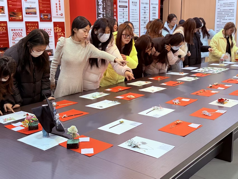 缠花以其精巧的工艺、雅致的造型彰显着东方美学,作品兼具观赏性与创新性,既有对传统纹样的传承,也融入了现代设计巧思,色彩明丽、构思精巧,直观展现出了非遗缠花技艺的魅力。在展览现场,学院领导,专职辅导员们细致观赏,认真聆听展品创作理念与技艺讲解,对社员们将传统技艺与创意结合的作品给予肯定。晚间,现场同学在社员指导下体验缠花制作,亲手尝试丝线缠绕、铜丝塑形,感受非遗技艺的动手乐趣。